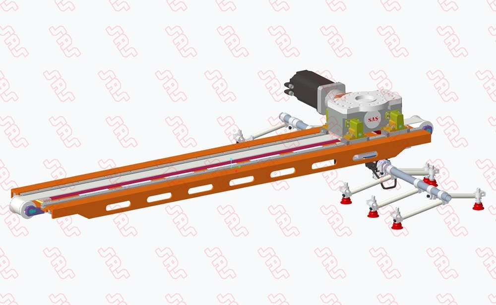 直線七軸采用雙倍速的機構,末端裝備了快換端拾器,能夠實現大型板料(不適合常規旋轉搬運軌跡)的直線搬運,提高生產節拍。